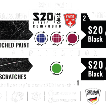 S20 Black Swiss Edition ir novatorisks un unikāls vienpakāpes augstas veiktspējas pulēšanas līdzeklis, kas piemērots plašam lietošanas spektram uz visām izplatītākajām krāsu sistēmām. Izstrādājot šo unikālo formulu, mūsu galvenais mērķis bija uzlabot noslaukšanas vieglumu un nodrošināt vienpakāpes pulēšanas līdzekļa ideālu lietošanu („EasyClean“ formula).