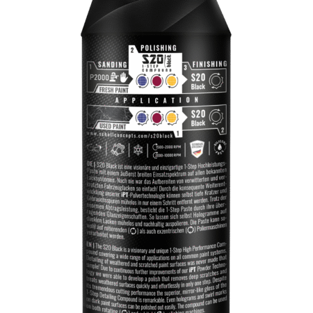 S20 Black ir novatorisks un unikāls 1-pakāpes augstas veiktspējas kompozīts, kas piemērots plašam lietojumu klāstam visās izplatītākajās krāsu sistēmās. Novecojušu un skrāpētu krāsu virsmu pulēšana nekad nav bijusi tik vienkārša!